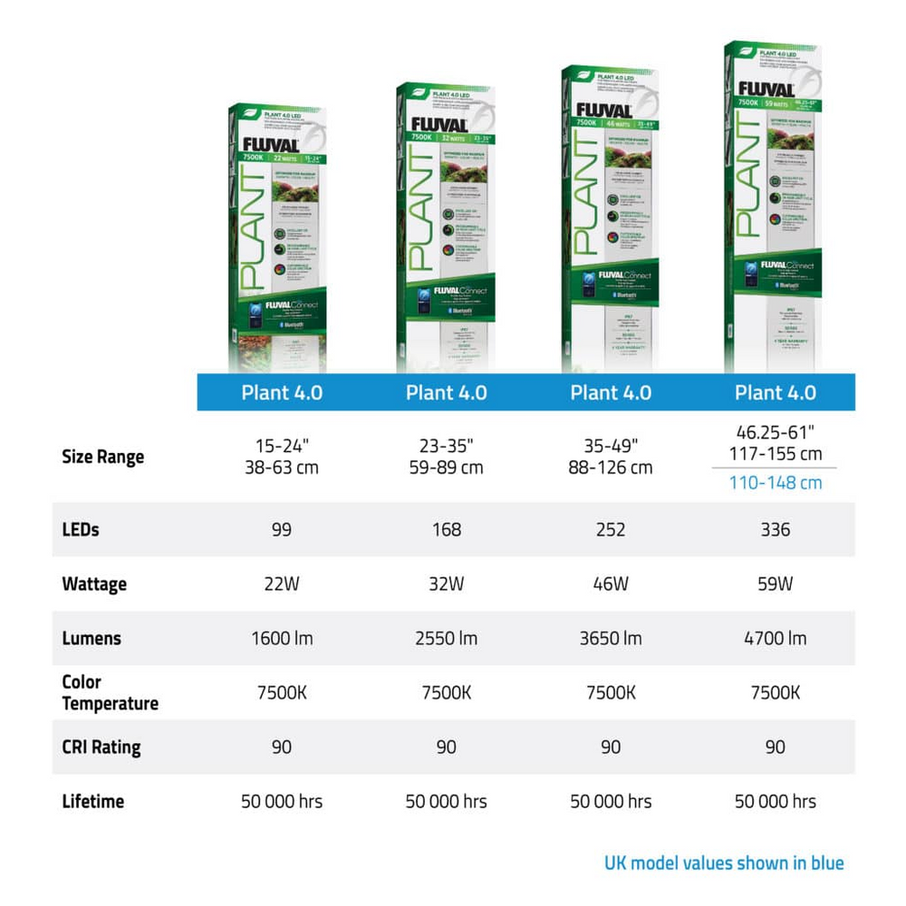 The German-engineered Fluval Plant 4.0 LED delivers brilliant, spectrum-specific illumination for optimal plant growth, colour and health. A superior 90 CRI rating guarantees vibrant colours, bringing your aquascape to life. With FluvalConnect app control, you can conveniently customize all light settings from your mobile device, including independent colour channels, a 24-hour light cycle, dynamic effects, pre-set environments, and several aquarium management features. The light unit offers advanced IP67-rated water, moisture and dust protection, along with a high quality glass lens for exceptional lighting performance and durability. Standard mounting options include extendable brackets as well as new height-adjustable riser brackets