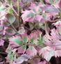 Foliage: Green leaves splashed with creamy white and flushed with pink (strongest in spring)