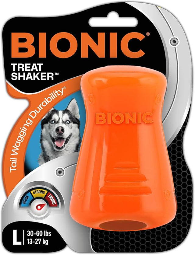 - Durable and Safe Playtime: Engineered with patented defensive geometry, the BIONIC Treat Shaker deflects incoming bite and chew forces, enhancing durability and safety. Its unique chew shape and mouth feel are designed to satisfy your dog's natural chewing instincts. Additionally, it bounces and floats, making it perfect for games of fetch and outdoor adventures.