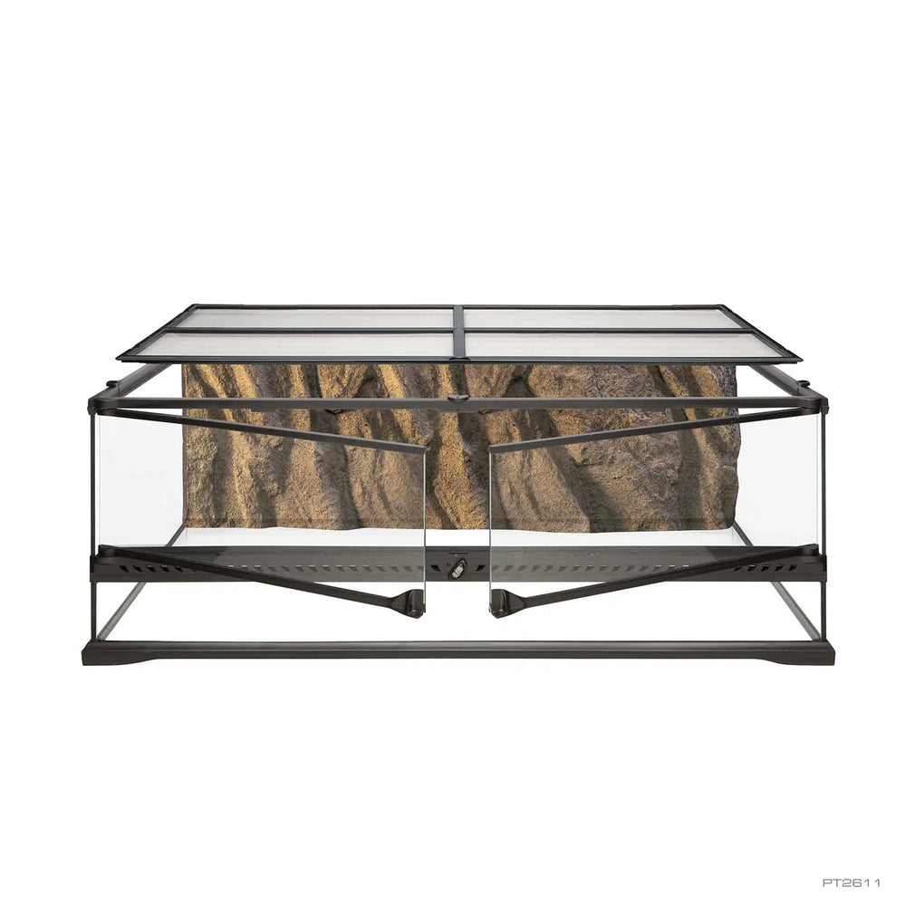 The Exo Terra Glass Terrarium is the ideal reptile or amphibian housing designed by European herpetologists. The front opening doors allow easy access for maintenance and feeding. A specially designed lock will prevent escape and the doors can be opened separately. The full screen top ventilation allows UVB and infrared penetration, and is completely removable for easy access while decorating or cleaning. In the back of the screen cover are 5 closable wire or tube inlets on both sides to install Heat Wave Rocks, Waterfalls, sensors, etc. inside the terrarium. The bottom plate of the terrarium is raised to mount a substrate heater to heat a part of the extended ground surface. The extra high fixed front window is ideal for thick layers of substrates (burrowing reptiles), aquatic parts (paludarium) or to mount an Exo Terra Reptile Den. The natural background has the same color as many other Exo Terra decoration items (Water Dishes, Waterfalls, Heat Wave Rocks, etc.) and provides an extra climbing dimension.